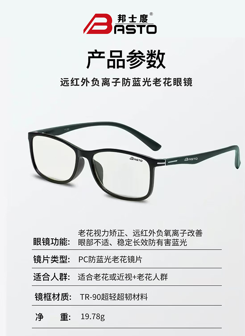2. 本质解决老花眼部机能减弱:首创从眼部衰老本质出发,通过镜框、镜架、鼻托等全部件特殊材料,解决眼部血液循环减慢、调节力下降等核心问题,而非仅针对视力矫正或光源伤害。